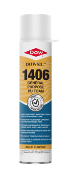 DOWSIL 1406 General Purpose Polyurethane Foam is a one-component, moisture-curing, self-expanding aerosol polyurethane foam.It is designed for easy dispensing using the straw adapter included with each can. Importantly, it does not contain any propellant gases that harm the ozone layer.